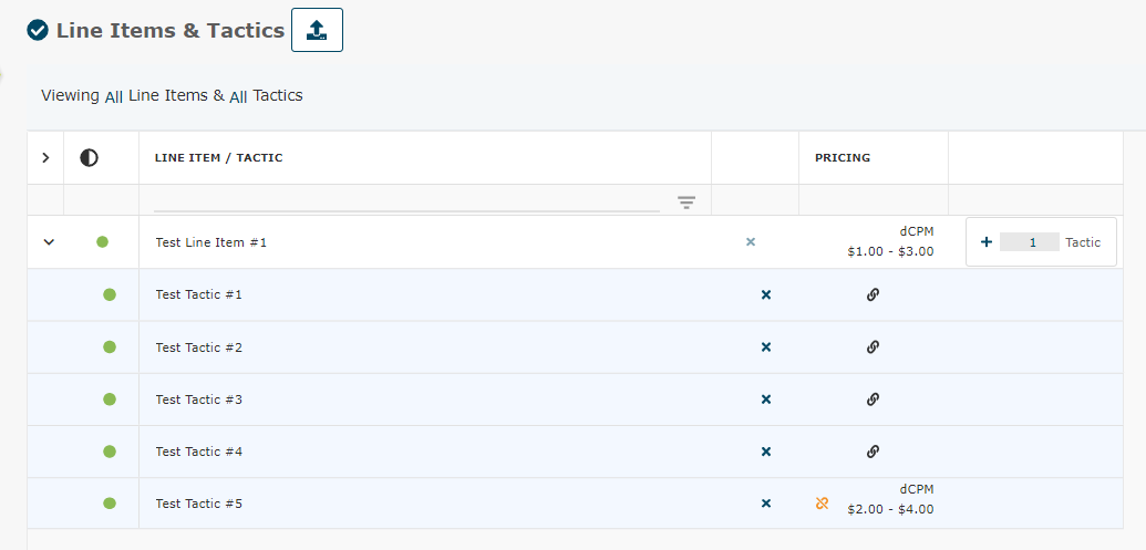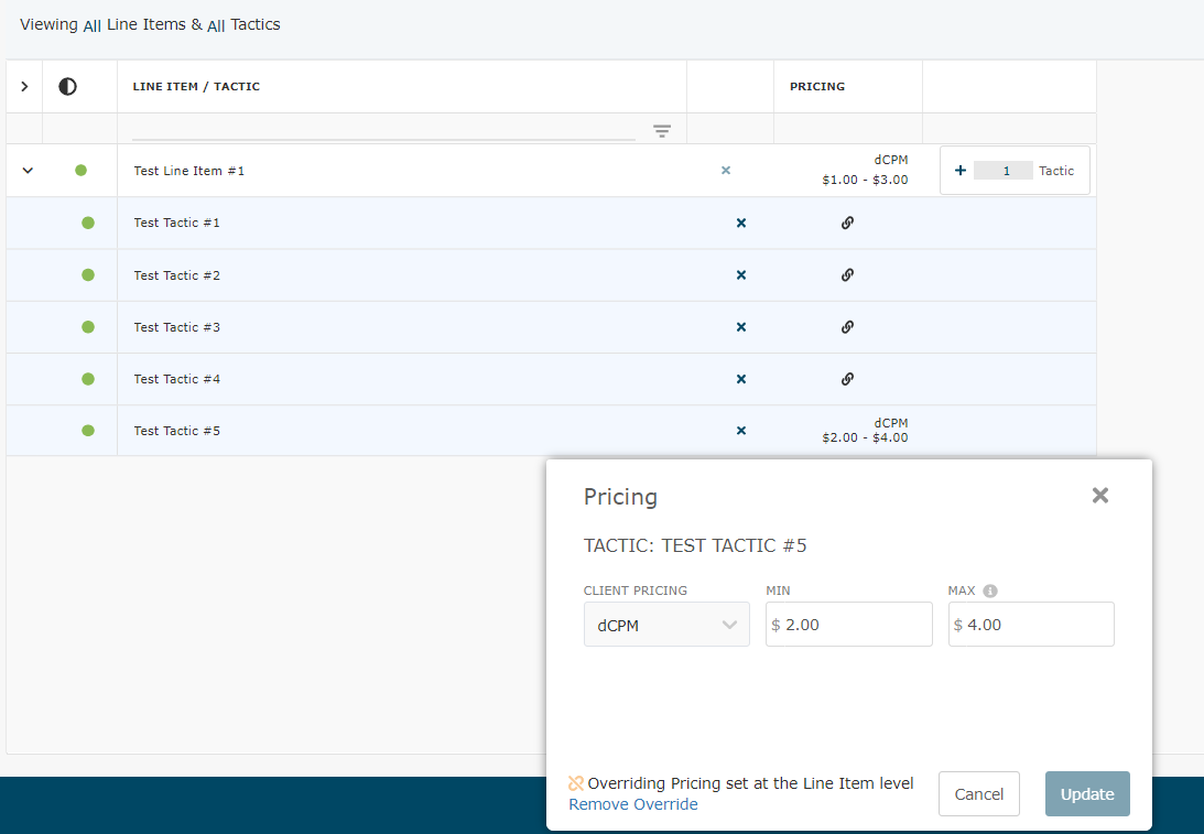For dCPM pricing, you can assign the min/max value at the line item level and tactic level examples below: