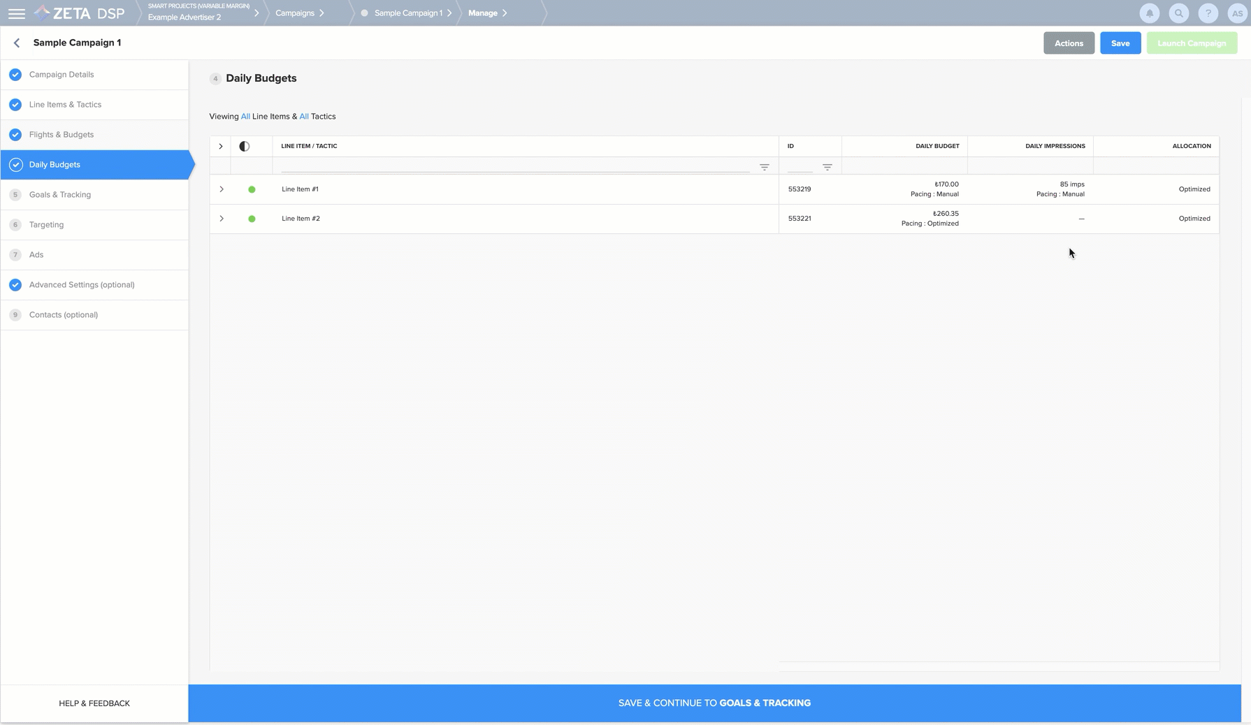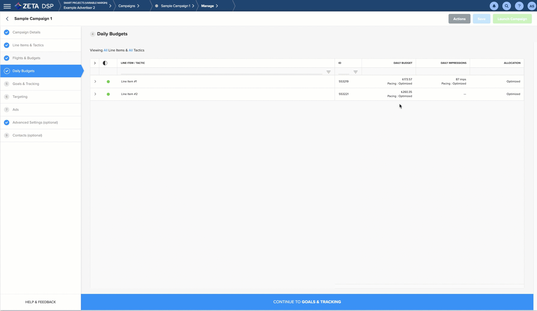 Once you’ve set up the pricing lines and assigned budgets to the Flights of your campaign, move on to the Daily Budgets tab within the Campaign Builder to can set the Pacing type and Daily Budget for each Line Item.