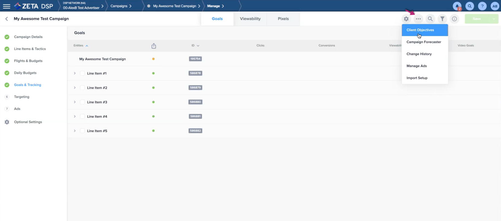 Zeta offers the ability to apply multiple goals to your campaigns, line items, or tactics. This feature allows you to optimize against two or more goals. While achieving all of your goals is an ideal state, this feature allows you to ensure your most important goals are secured first.