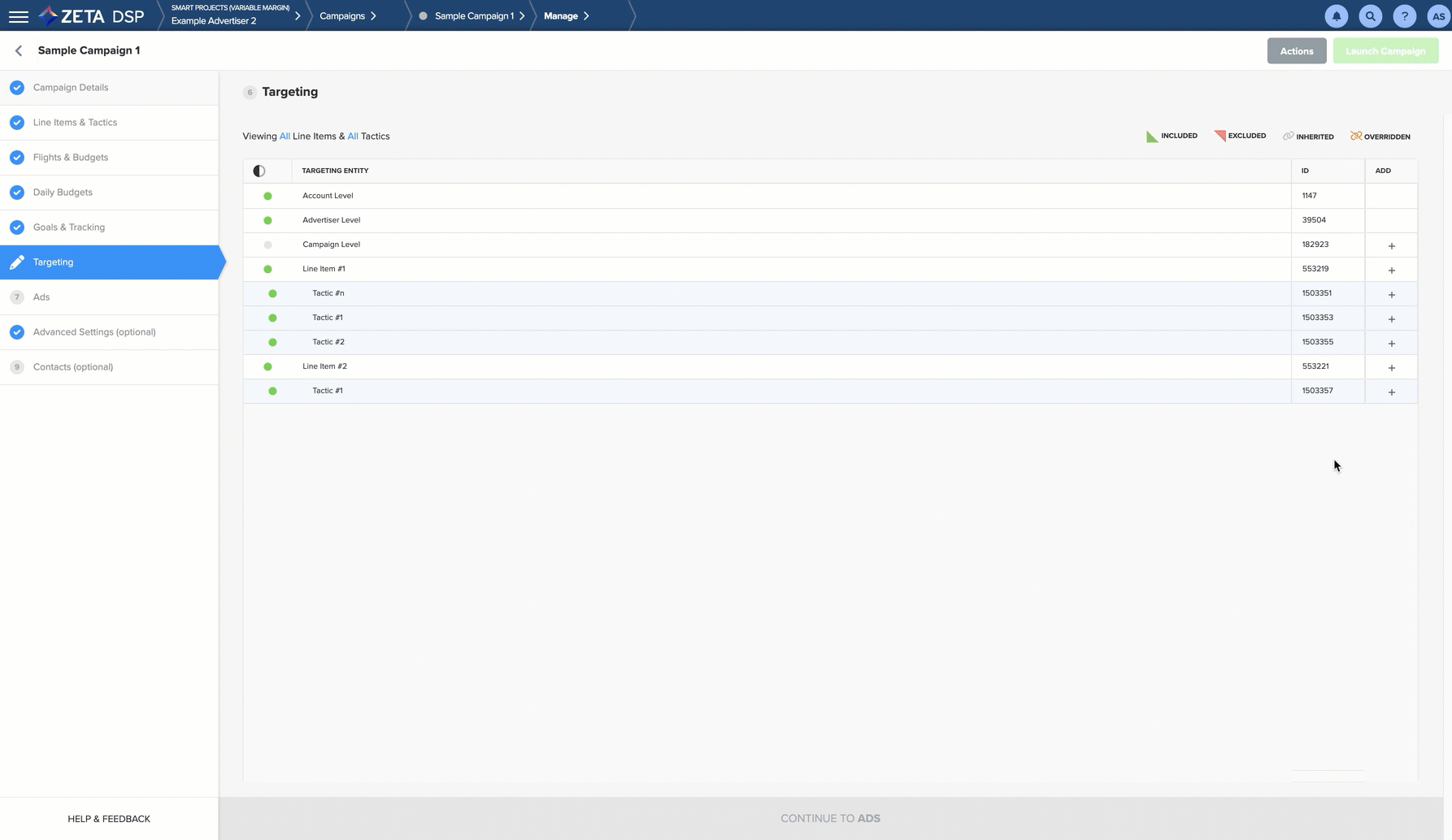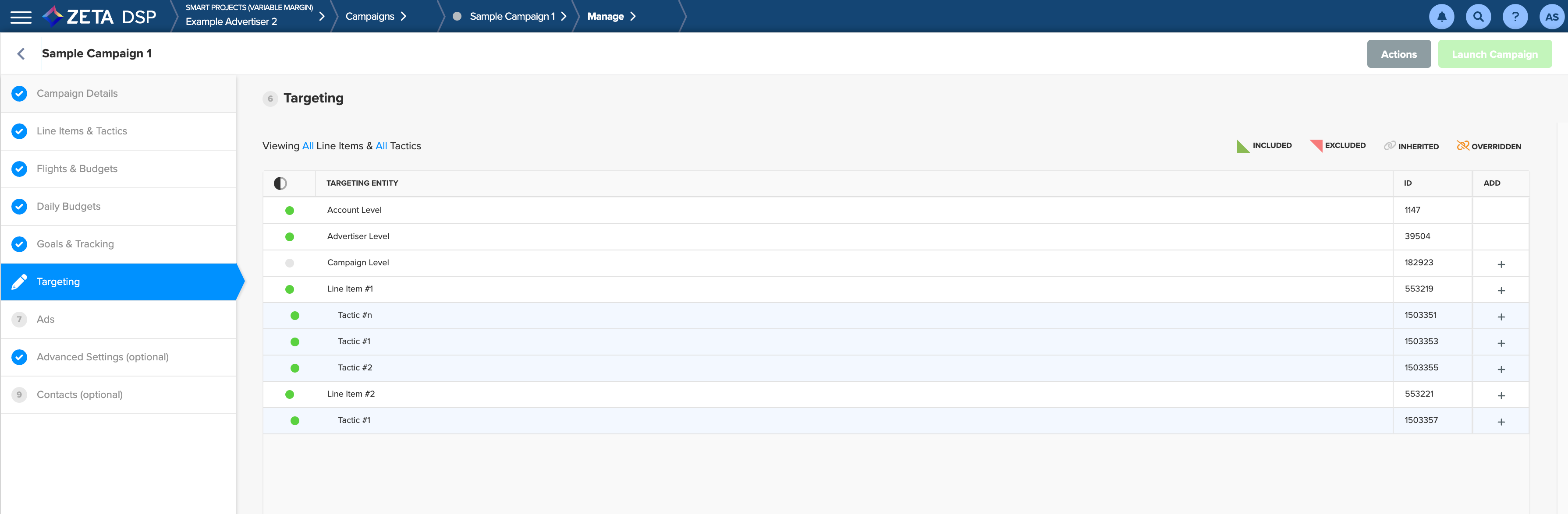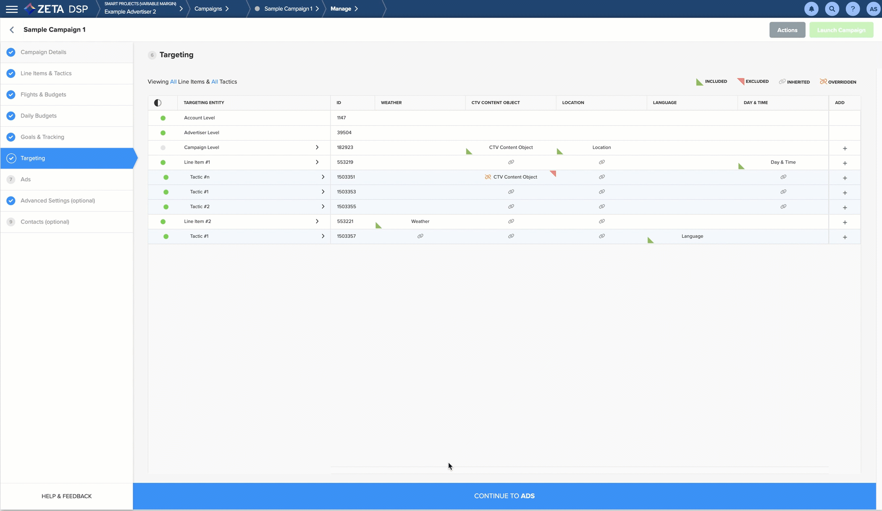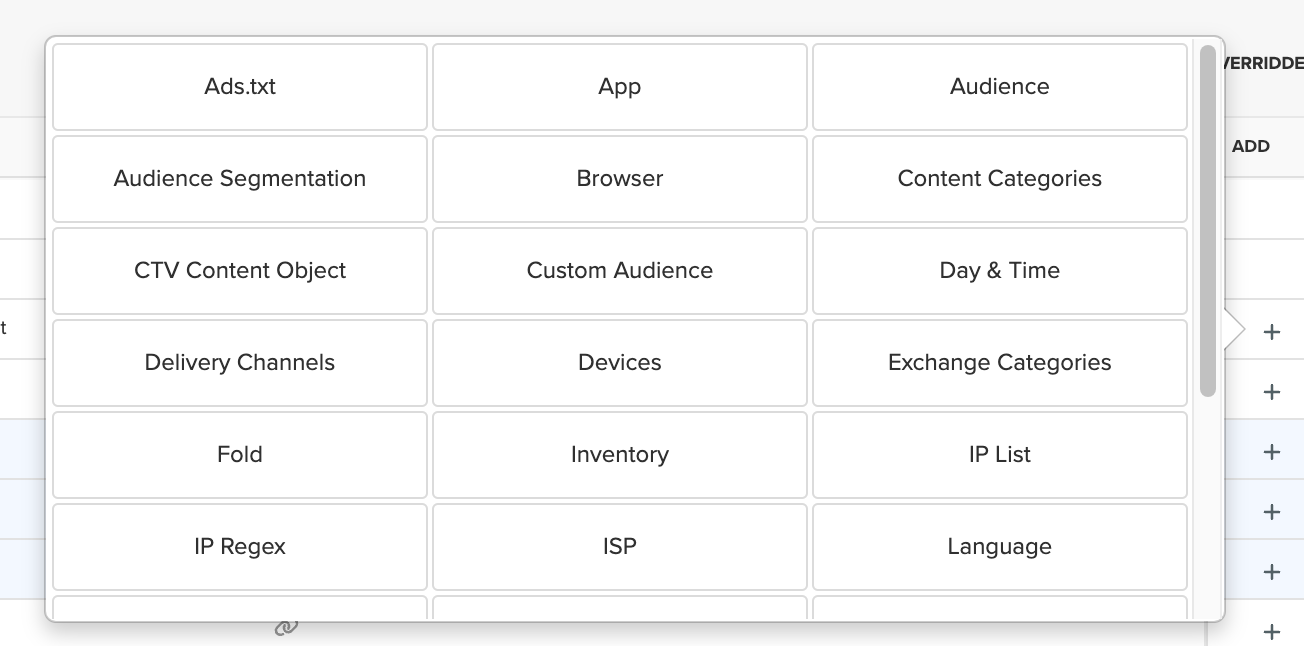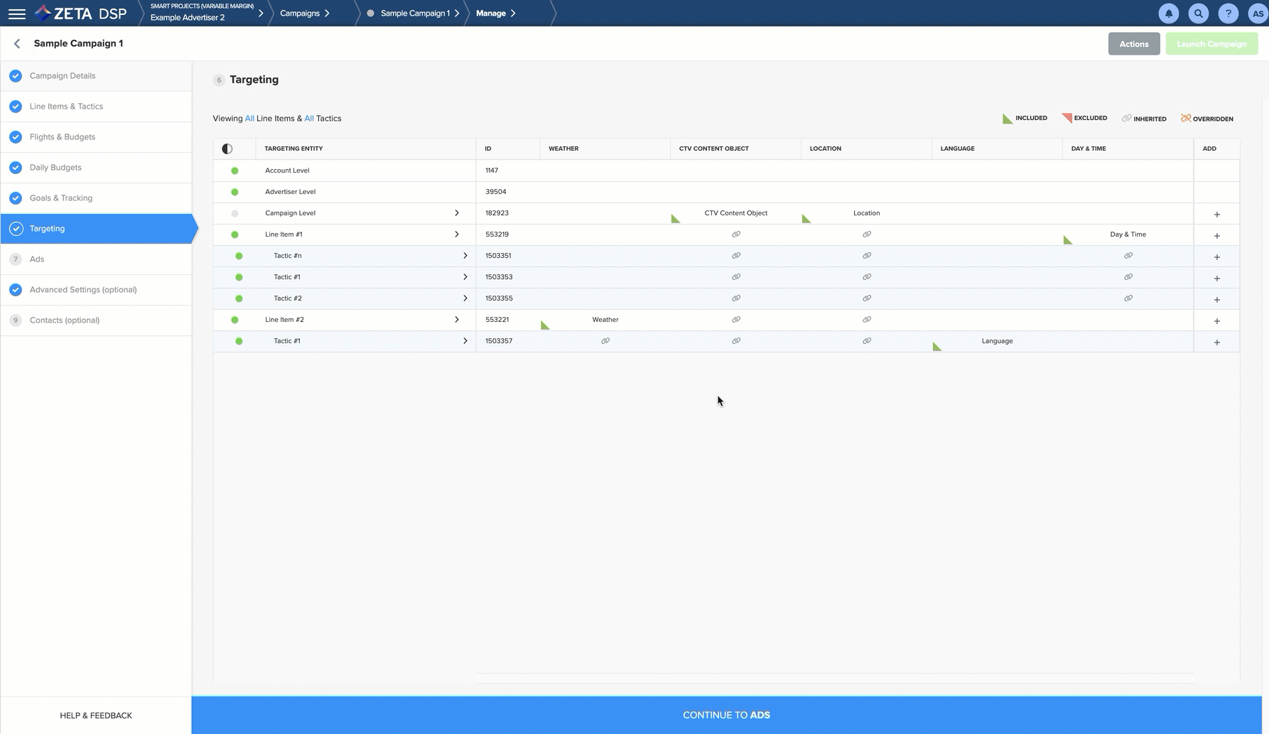 Targeting rules are inherited through the DSP. Any targeting set at the Account-level is inherited by each advertiser, campaign, line item, and tactic within that Account.