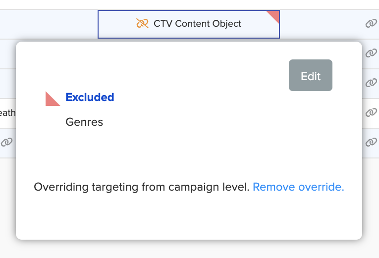 If you have overridden any inherited targeting rules and set targeting restrictions for the campaign, or it's line-items/tactics, the broken orange Overridden icon appears. | |