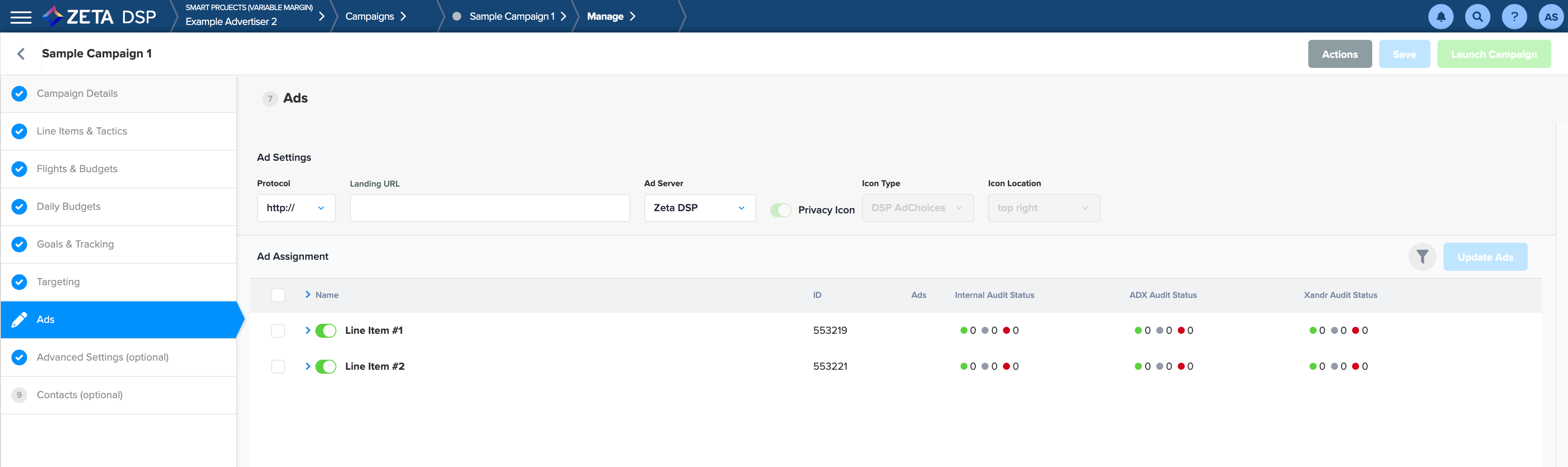 Landing URL | This field is used for ads assigned to the campaign, if they are not declared on the ad itself, the ad will inherit the campaign's landing URL. | |