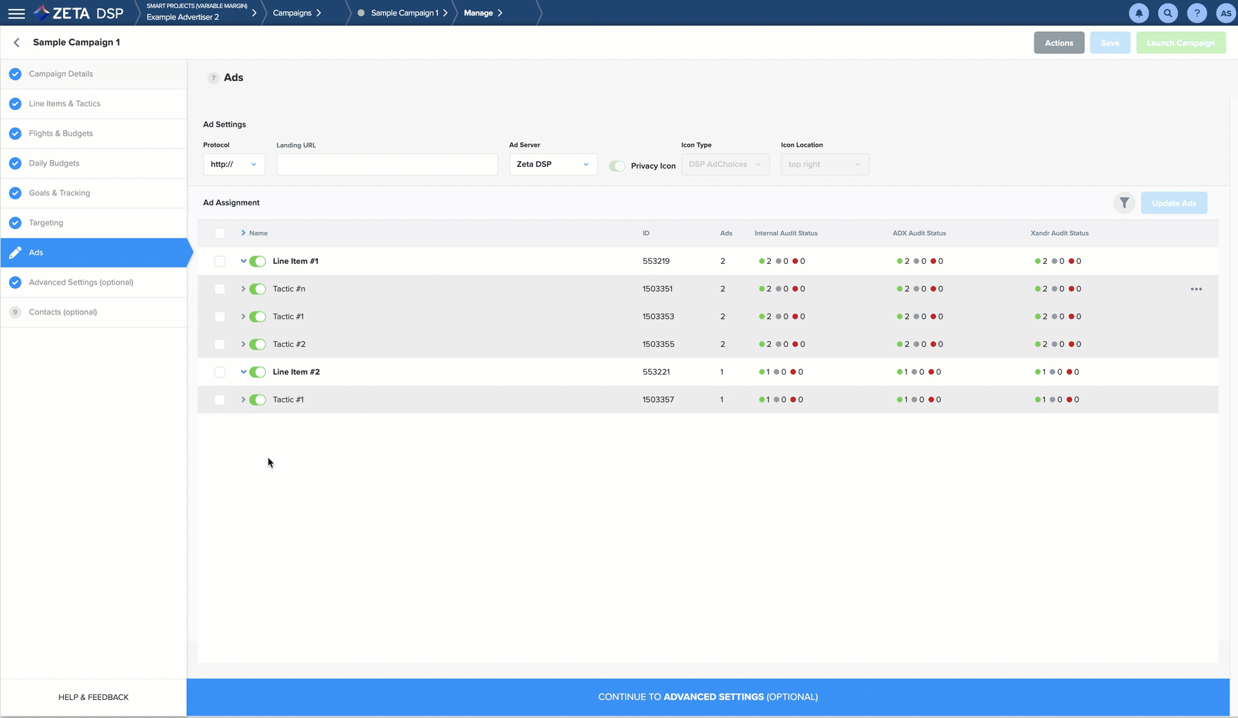 7. Click on Save & Continue to Advanced Settings (Optional) at the bottom of the screen to continue building your campaign.
