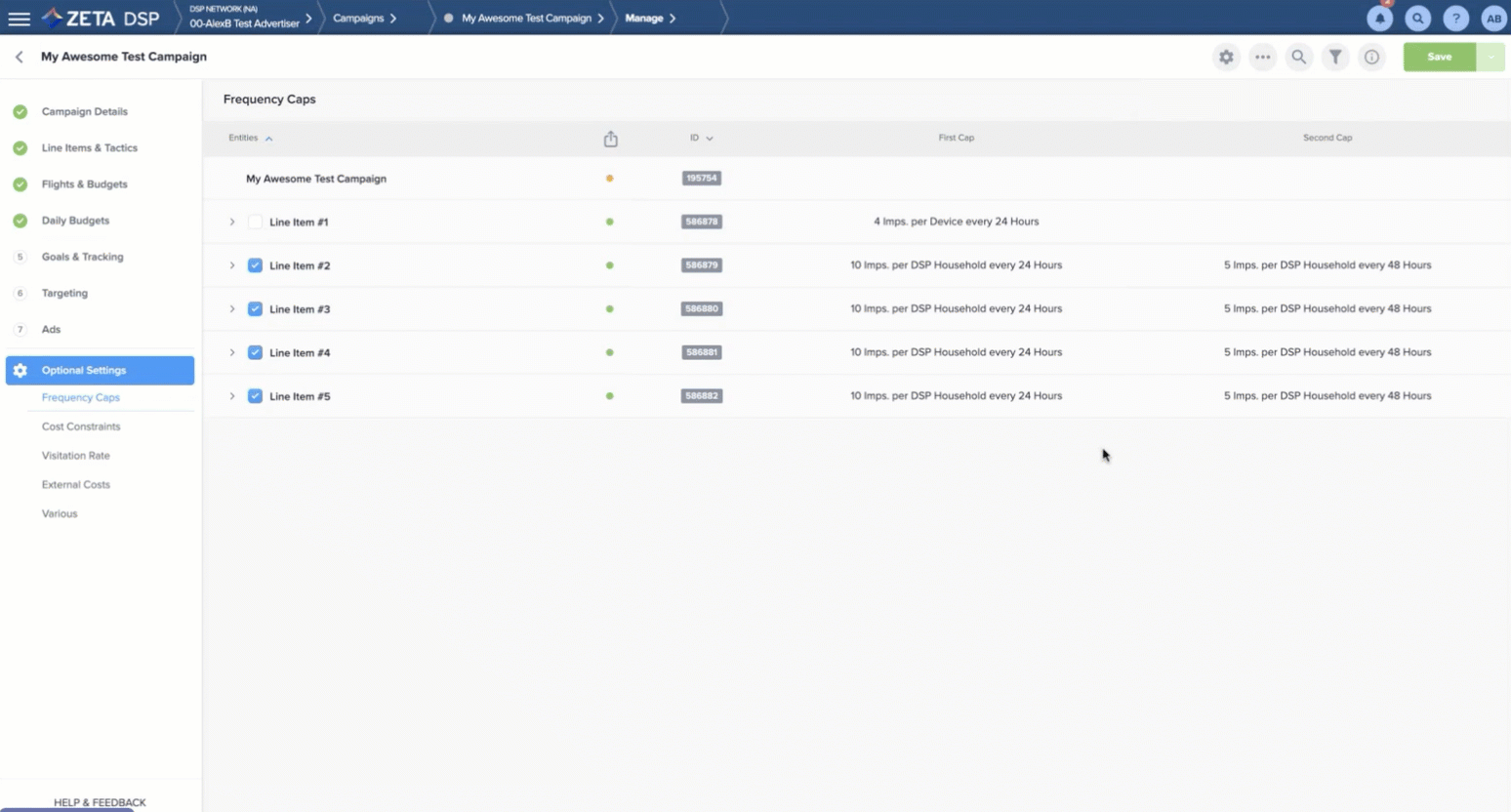 1. Navigate to Optional Settings > Frequency Cap, and click on the line item you want to set the cap(s) for.