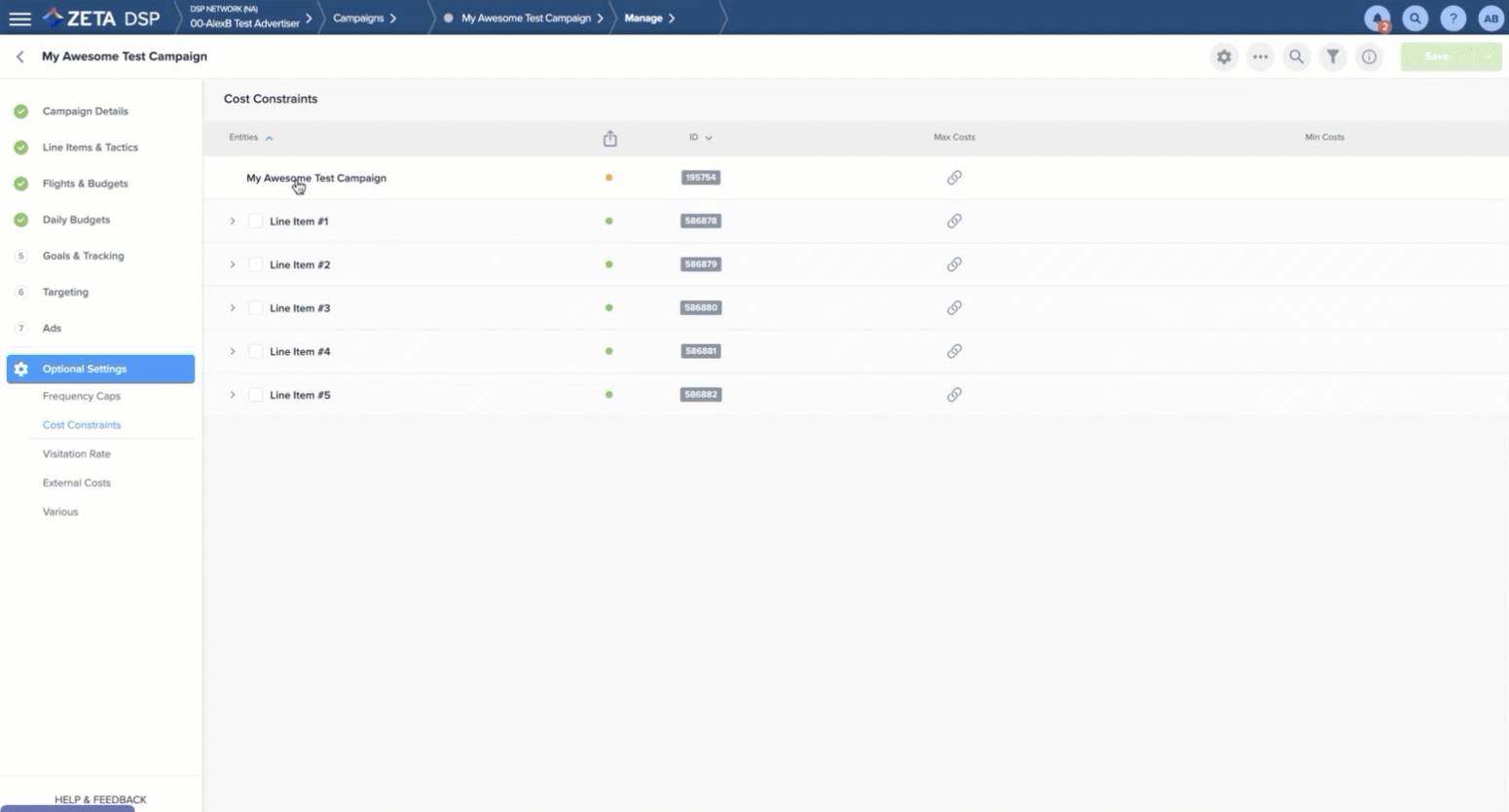 1. Navigate to Optional Settings > Cost Constraints, and click on the campaign to set it minimum and maximum margin.