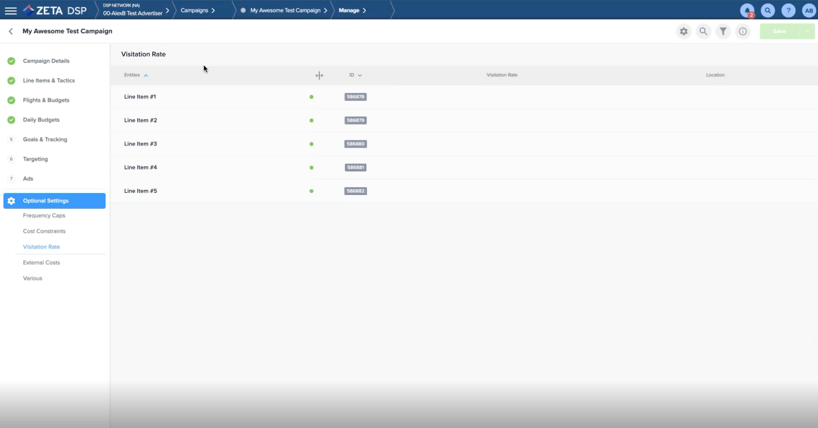 Navigate to Optional Settings > Visitation Rate, and click on the campaign or line items to set the rate(s), following the same steps as mentioned above.
