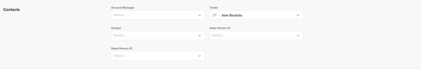 Select an Account Manager, Trader, Analyst, Sales Person #1, and Sales Person #2 from the respective dropdowns.