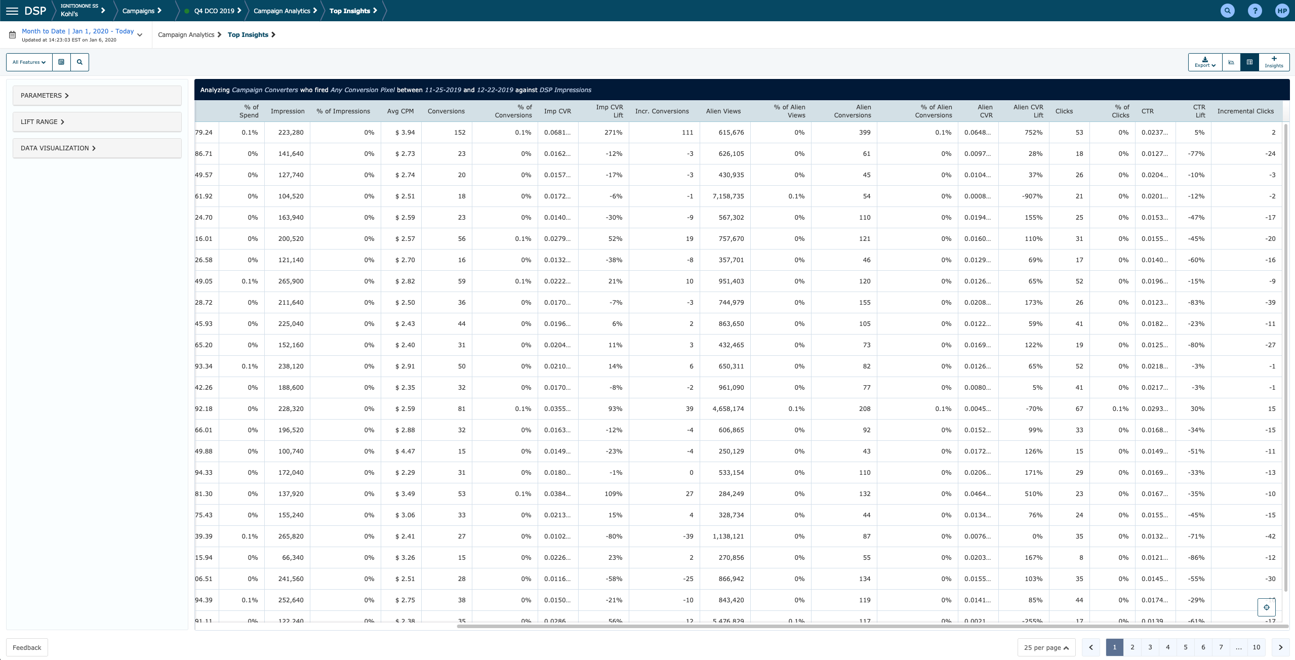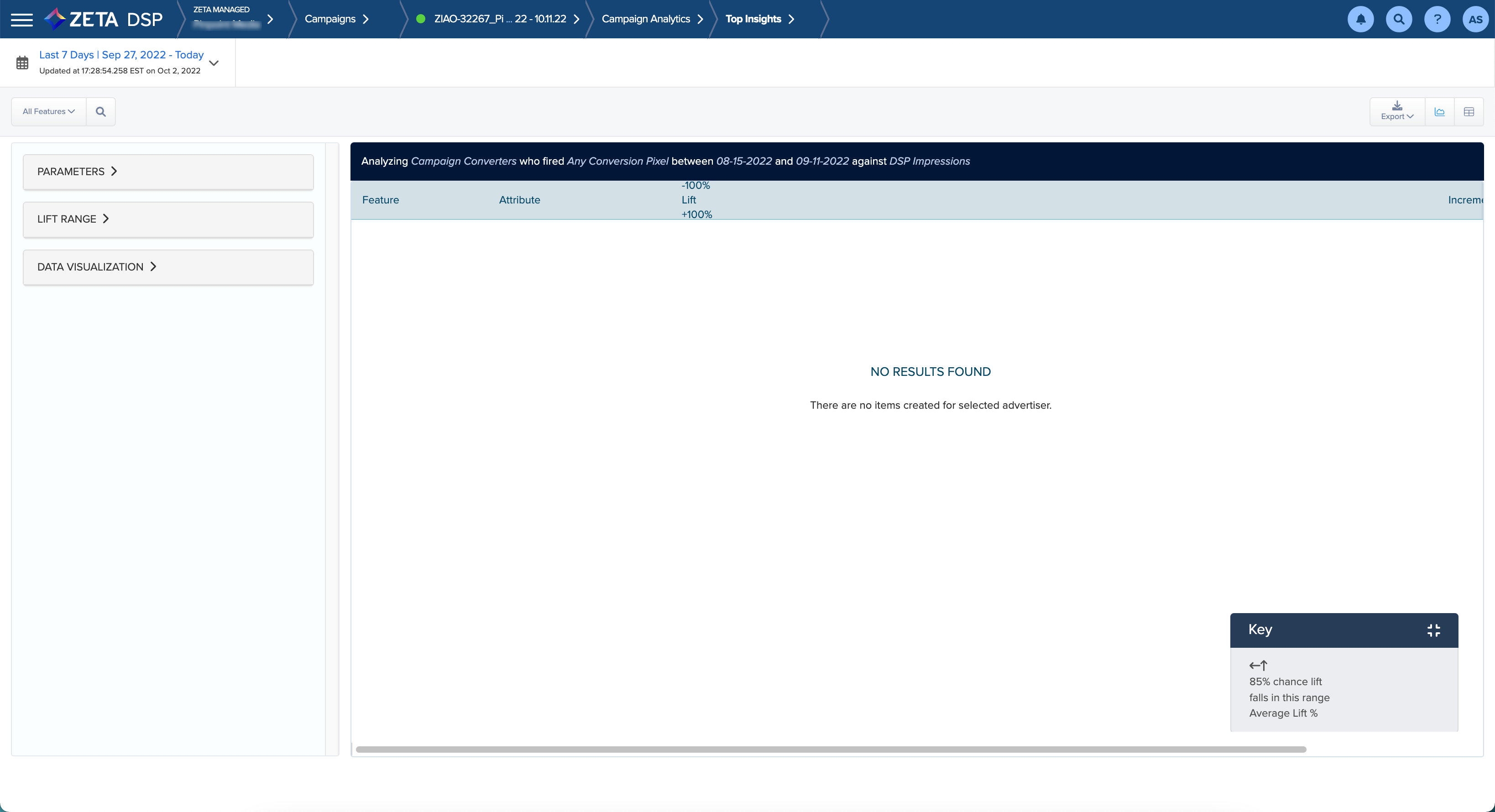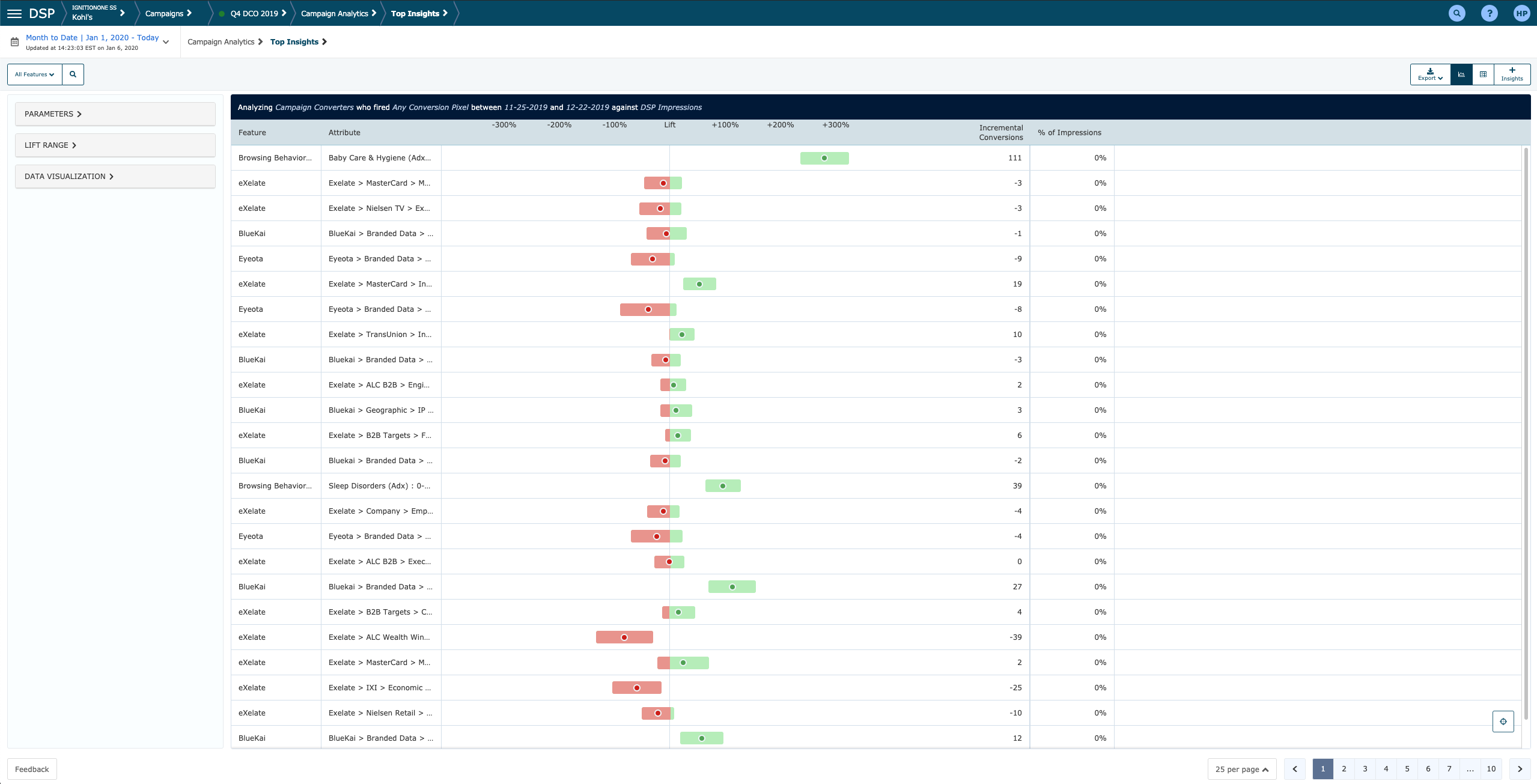 Top Insights shows the lift, impact, and delivery of all behavioral and contextual attributes in your campaign. Top Insights measures the lift of each attribute against the campaign's baseline, not the feature's baseline, thus allowing you to evaluate the performance of attributes across data providers or feature categories. This report shows each attribute's lift as it delivers each individual day. You can:
