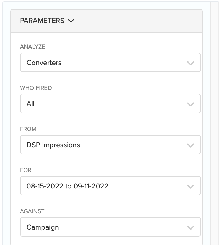 If a campaign is ingesting just Conversions from an External Report, then "From: All Sources" should be selected when pulling data against Converters. "From: DSP Impressions" can be used in this scenario when pulling data against Clickers
