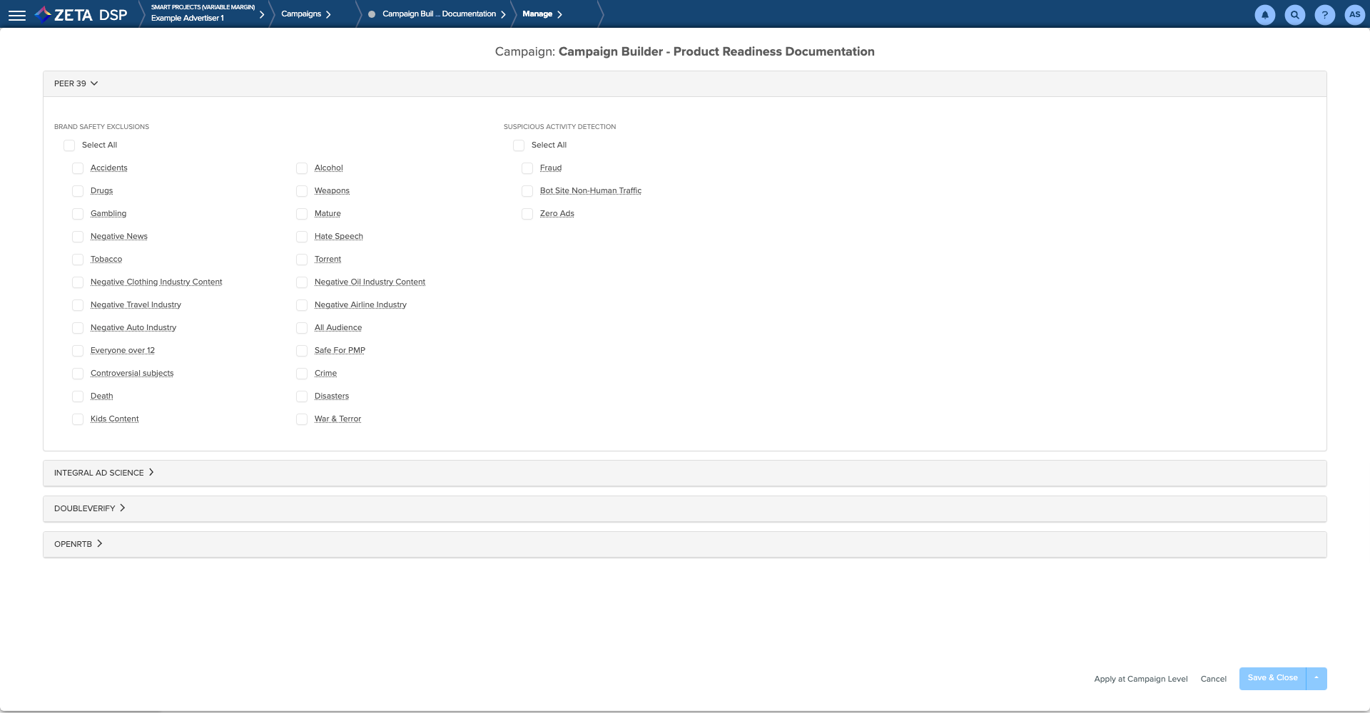 On the Peer 39 Brand Safety screen, select the categories to exclude and then click on Save & Close.