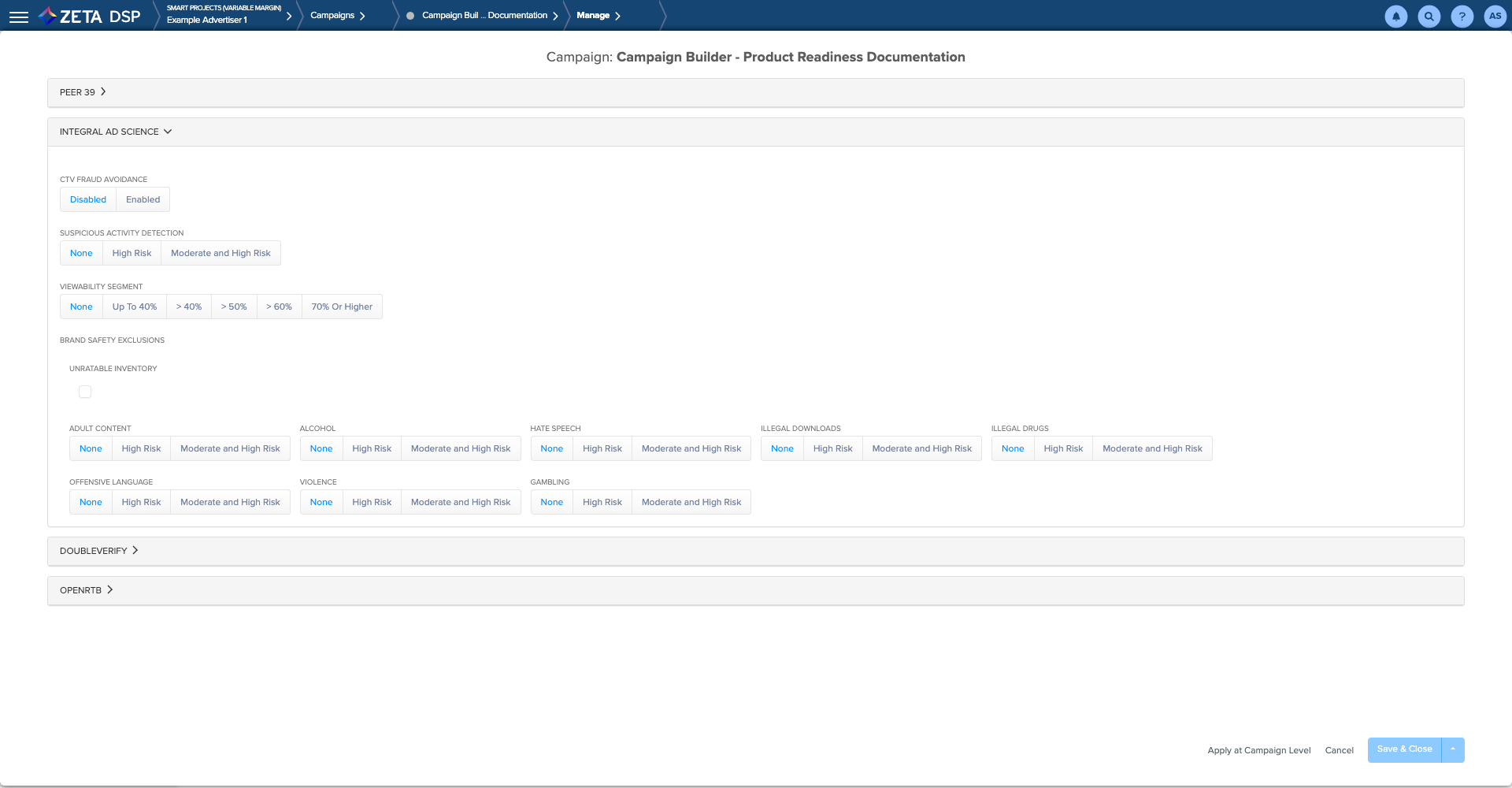 Use Traffic Quality targeting to see additional Peer39 content categories that may be blocked. The Integral Ad Science (IAS) pre-bid solution may also be selected to optimize campaigns.