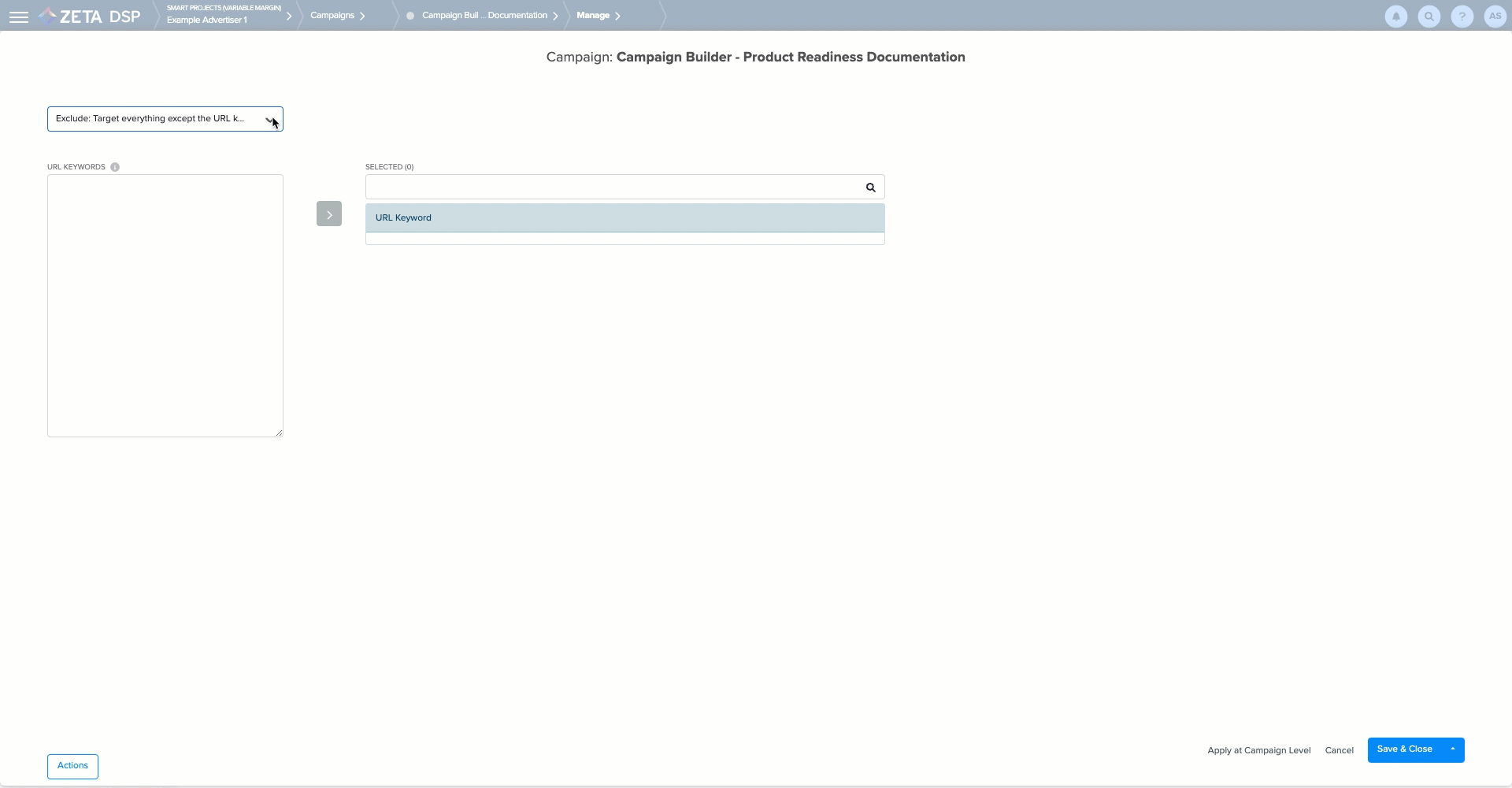 5. Click on > to move the added URL Keywords to the Selected column on the right for appropriate targeting.