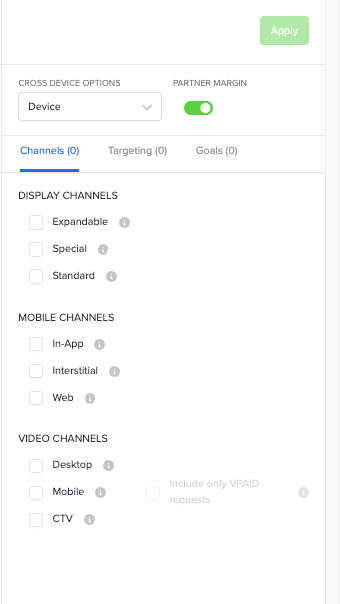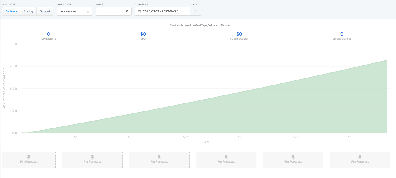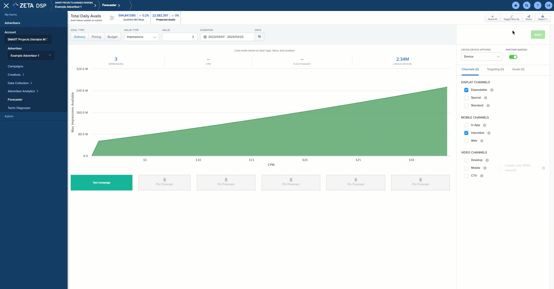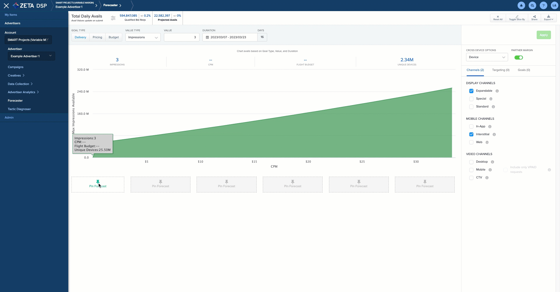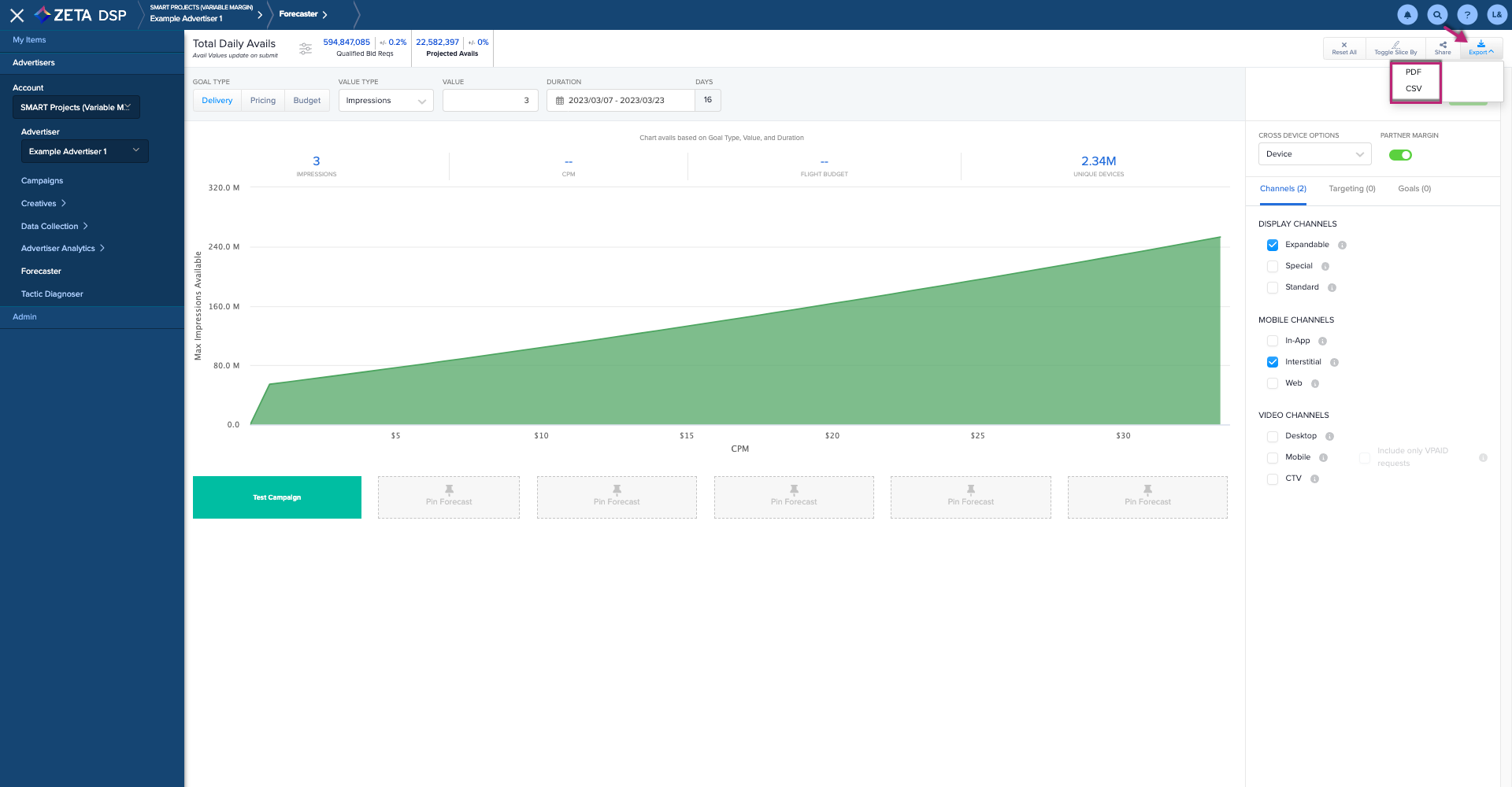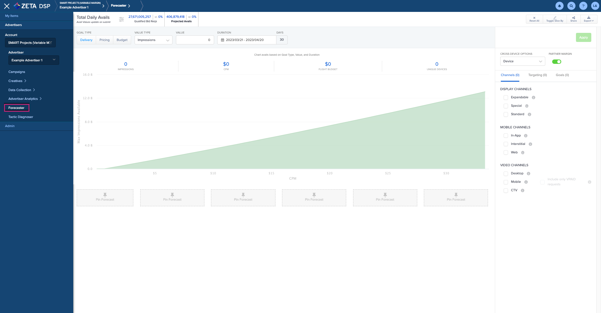 Click on the DSP logo in the upper left corner. Within the menu that appears for Advertisers and Admin, select your desired account and advertiser. Click on Forecaster.