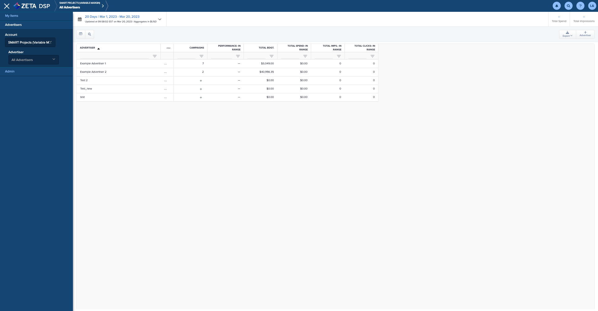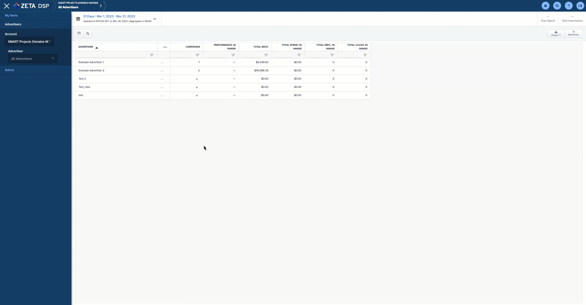 The Advertiser's Grid appears as soon as you open the Zeta DSP. All available Advertisers associated with the selected Account are listed: